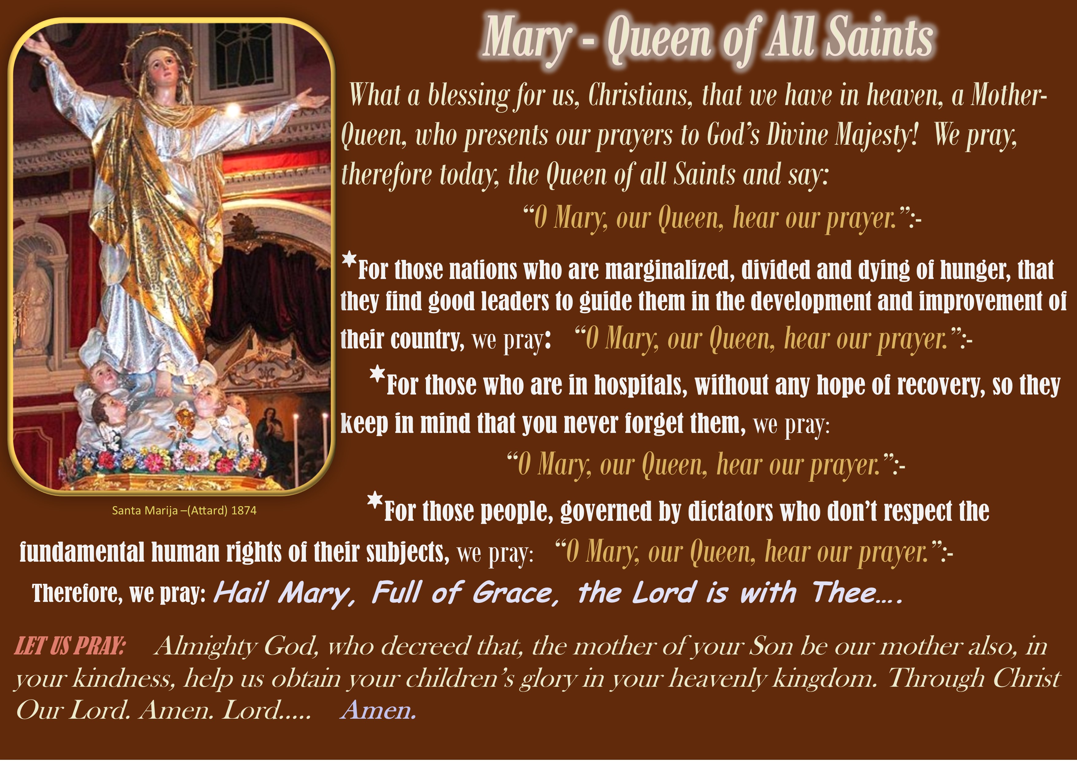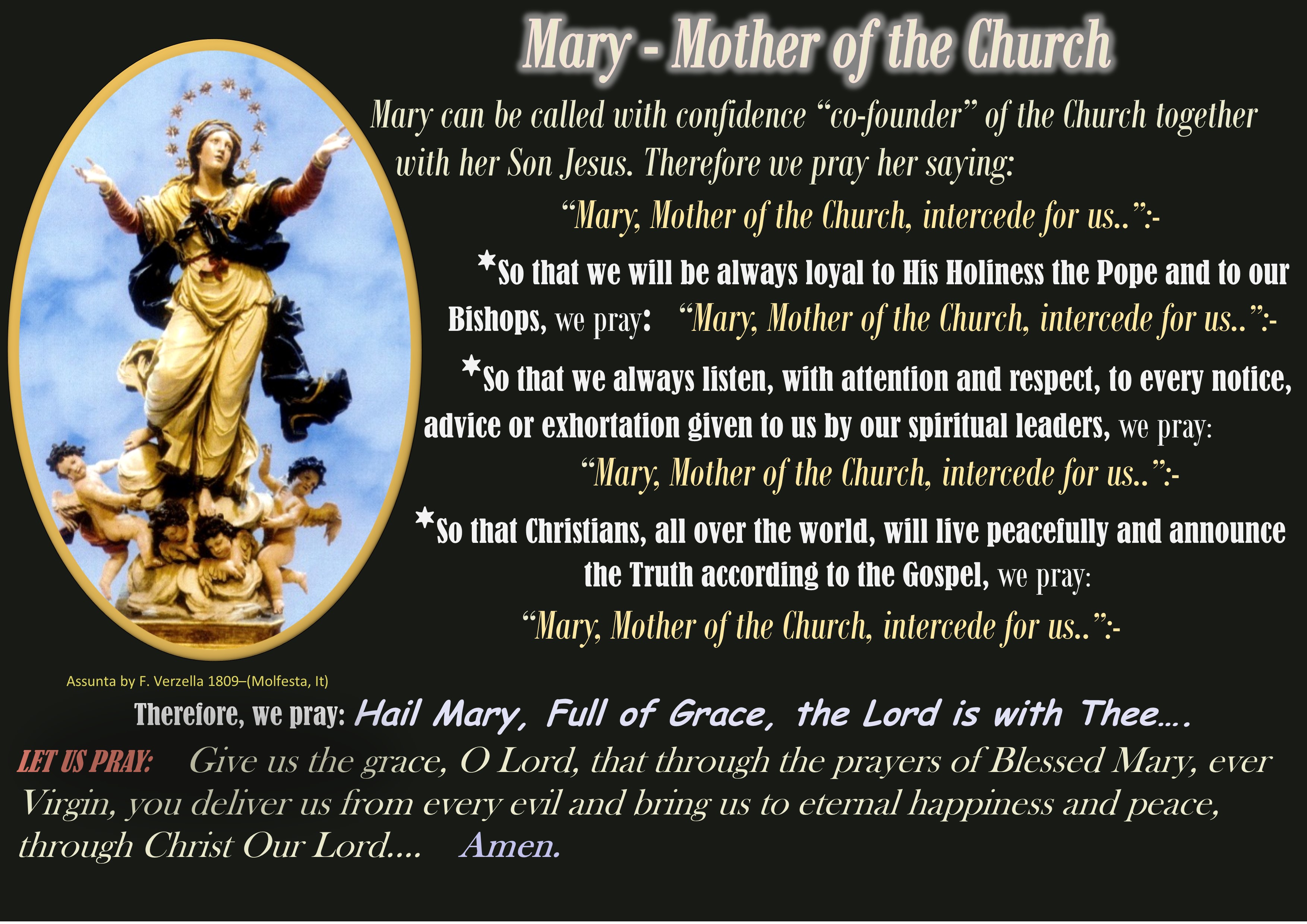 O Mary, most holy, we greet you as our gracious Queen. You are the mighty and glorious protector of the Church. In the midst of our anguish, struggle and distress, you defend us from the power of the enemy, and stand ready to receive our soul in heaven at the hour of our death.