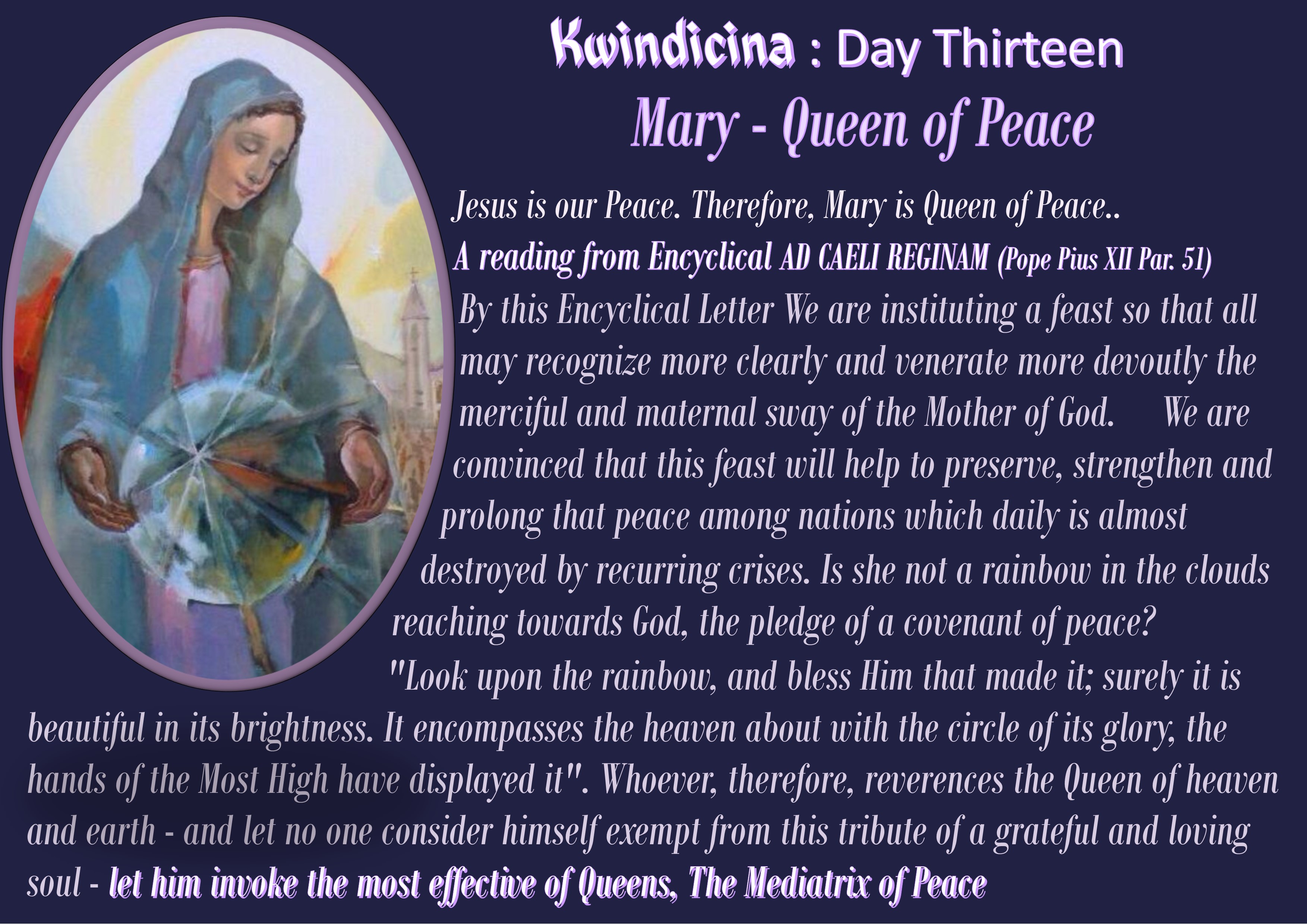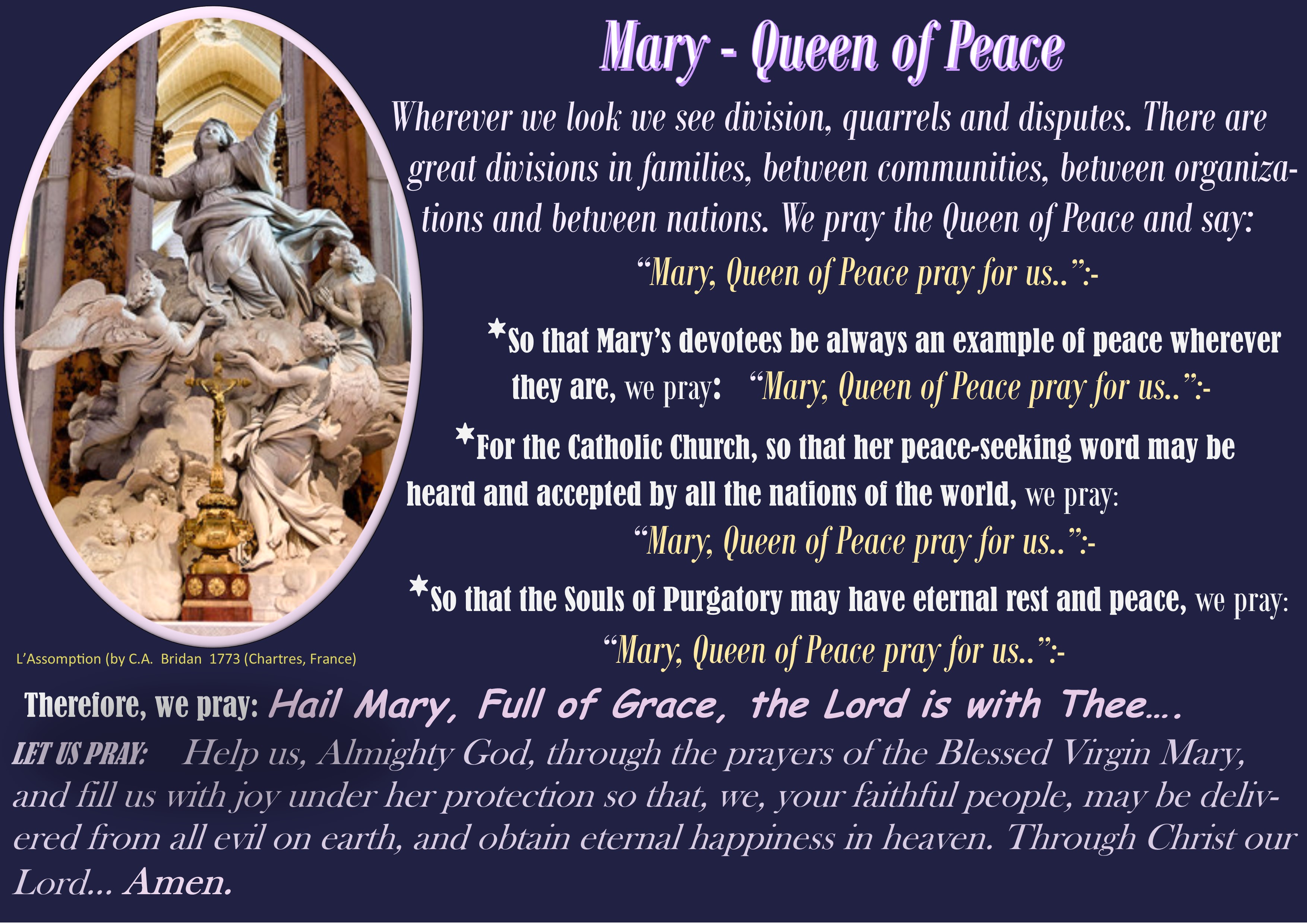 Most holy and immaculate Virgin, Mother of Jesus and our loving Mother, being his Mother, you shared in His universal kingship. The prophets and angels proclaimed Him King of Peace. With loving fervour in our hearts, we salute and honour you as Queen of Peace.
