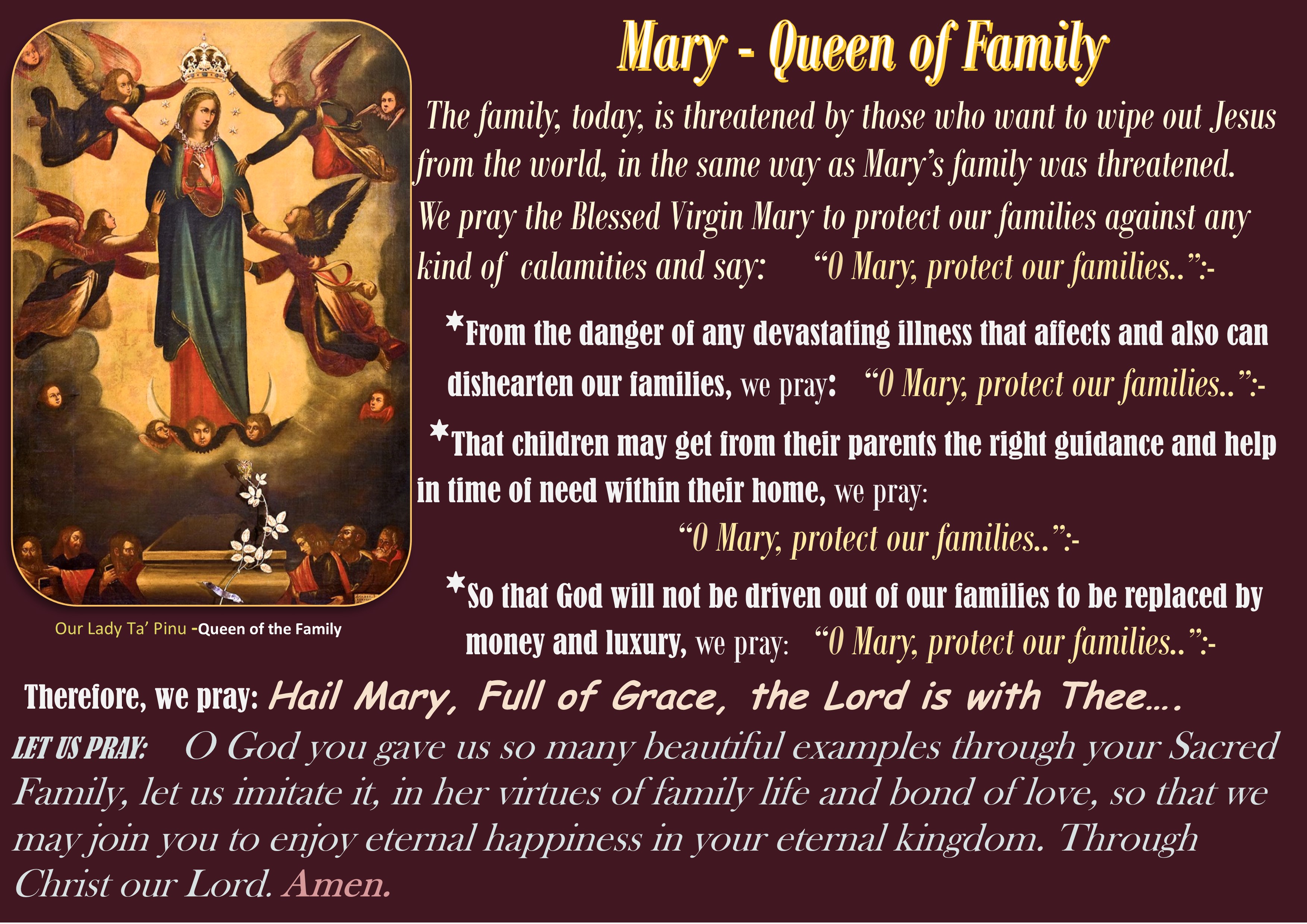 Thank you for all that we have received from you who joined us on this journey, especially for the warmth of your devotion and the support of your prayers. We turn now in prayer to Mary, Mother of the Church and Queen of Heaven,QUEEN OF OUR FAMILY, as we rejoice in the Resurrection of the One whom she bore in her womb.