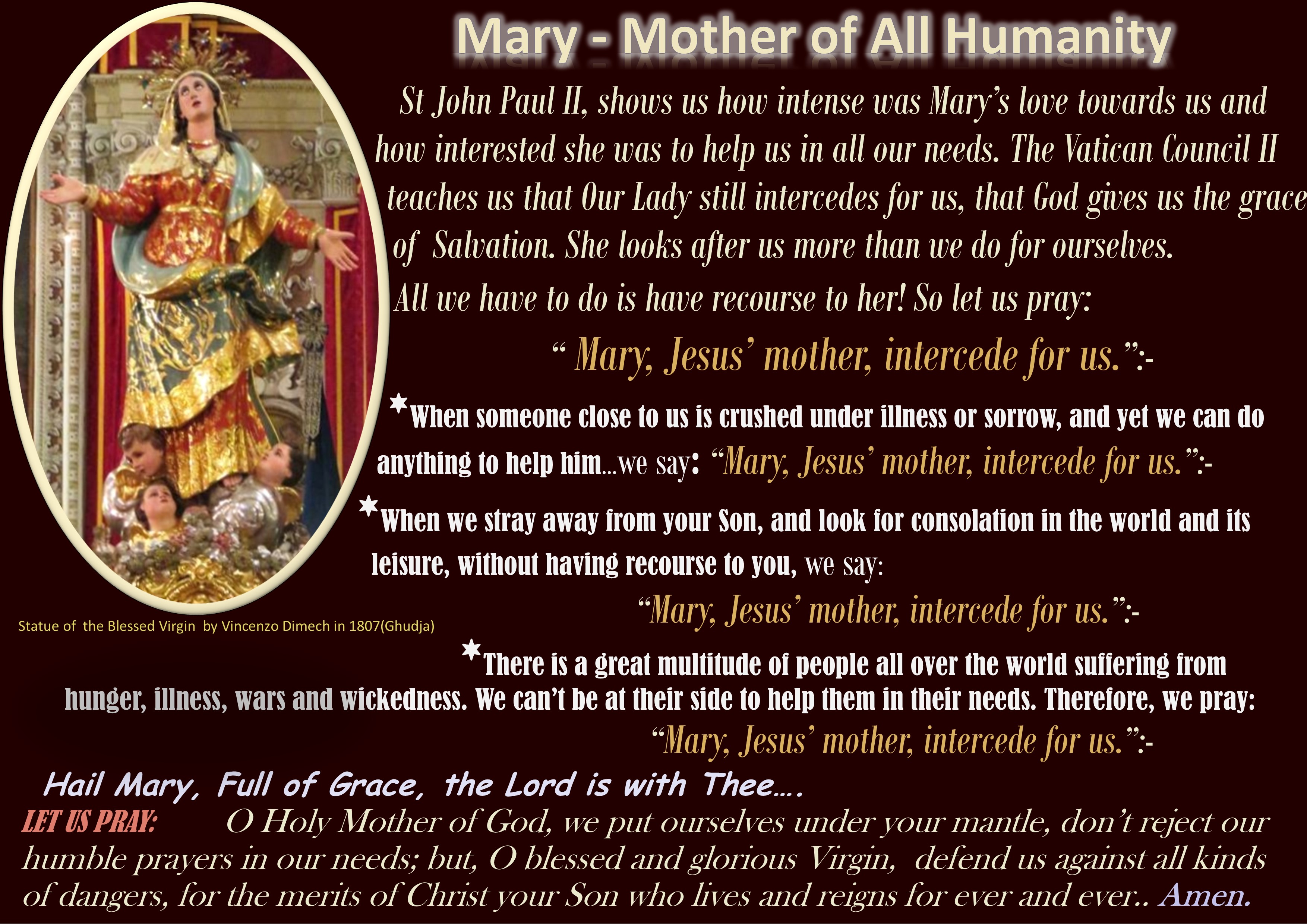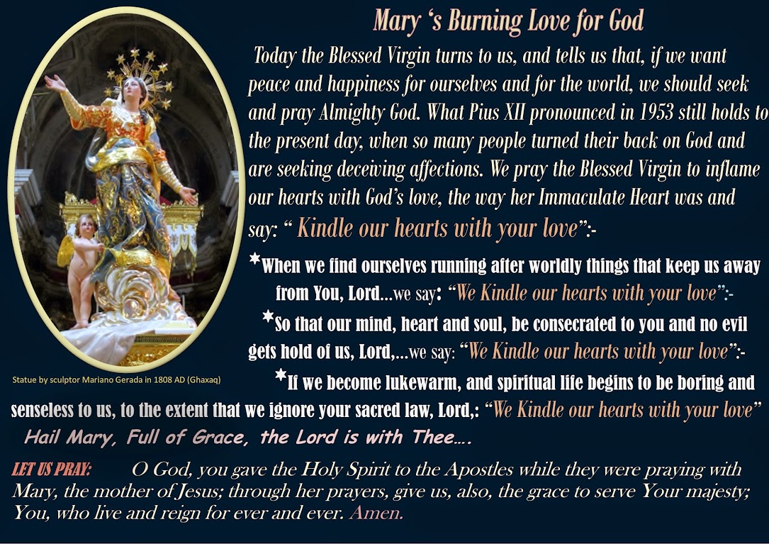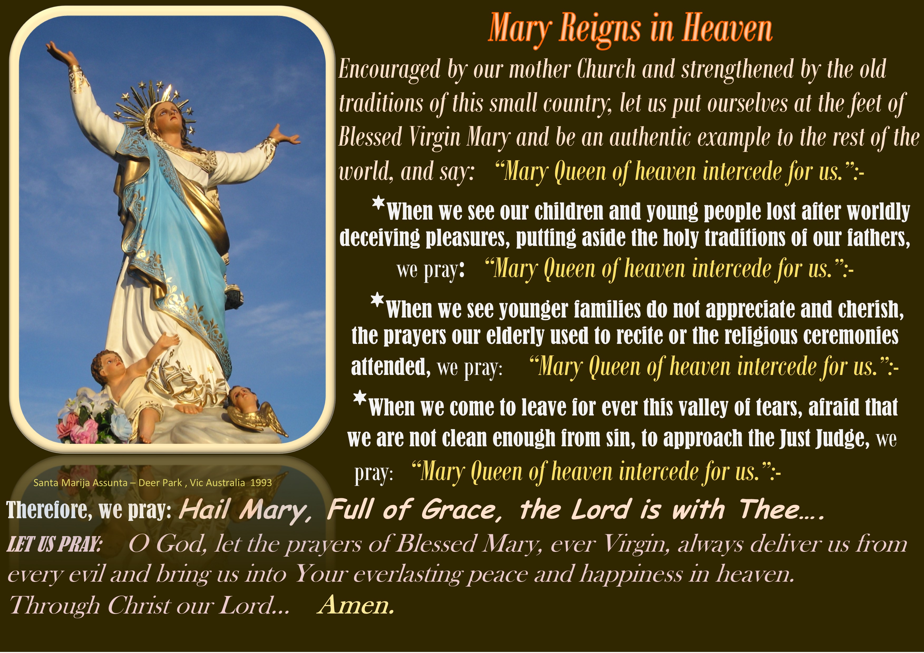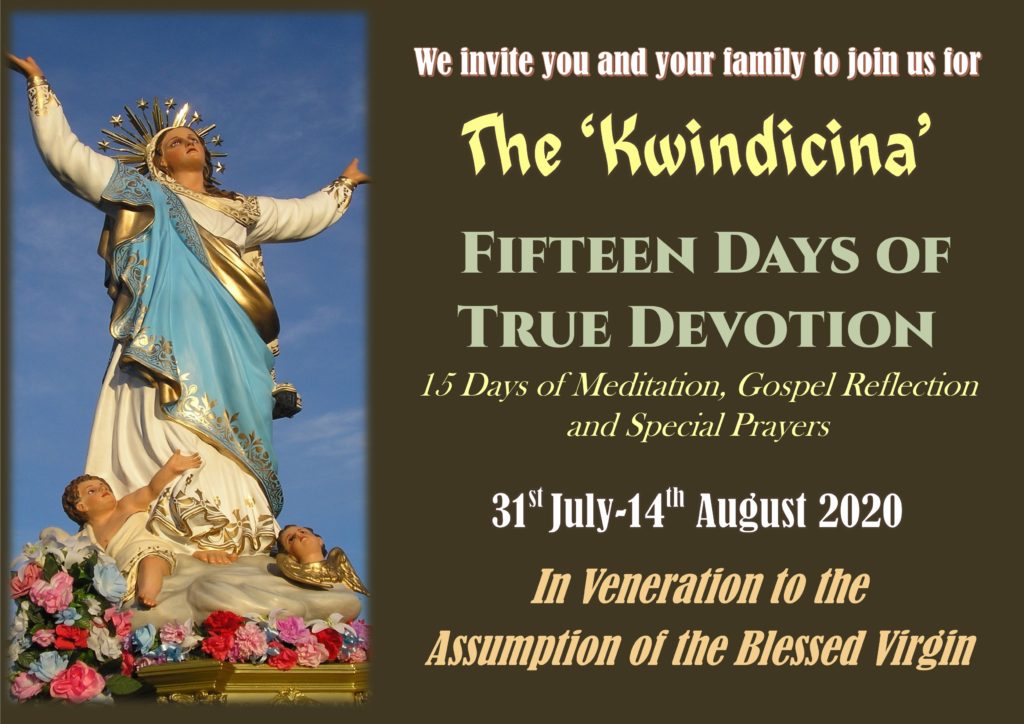 The “Fifteen-day” devotion “Kwindicina” is a devotion to Our Lady as a preparation to the Solemnity of the her Assumption into heaven, it was included in the Maltese Ritual of Sacraments and Popular devotions issued in 1967. We, as a Nation, are very obliged to the Feast of the Assumption of The Blessed Virgin. Wishing that this devotion reaches, as many devotees of Our Lady as possible, we decided to publish these beautiful thoughts adapted from Fr. A. Dimech’s book published in May 2002.
