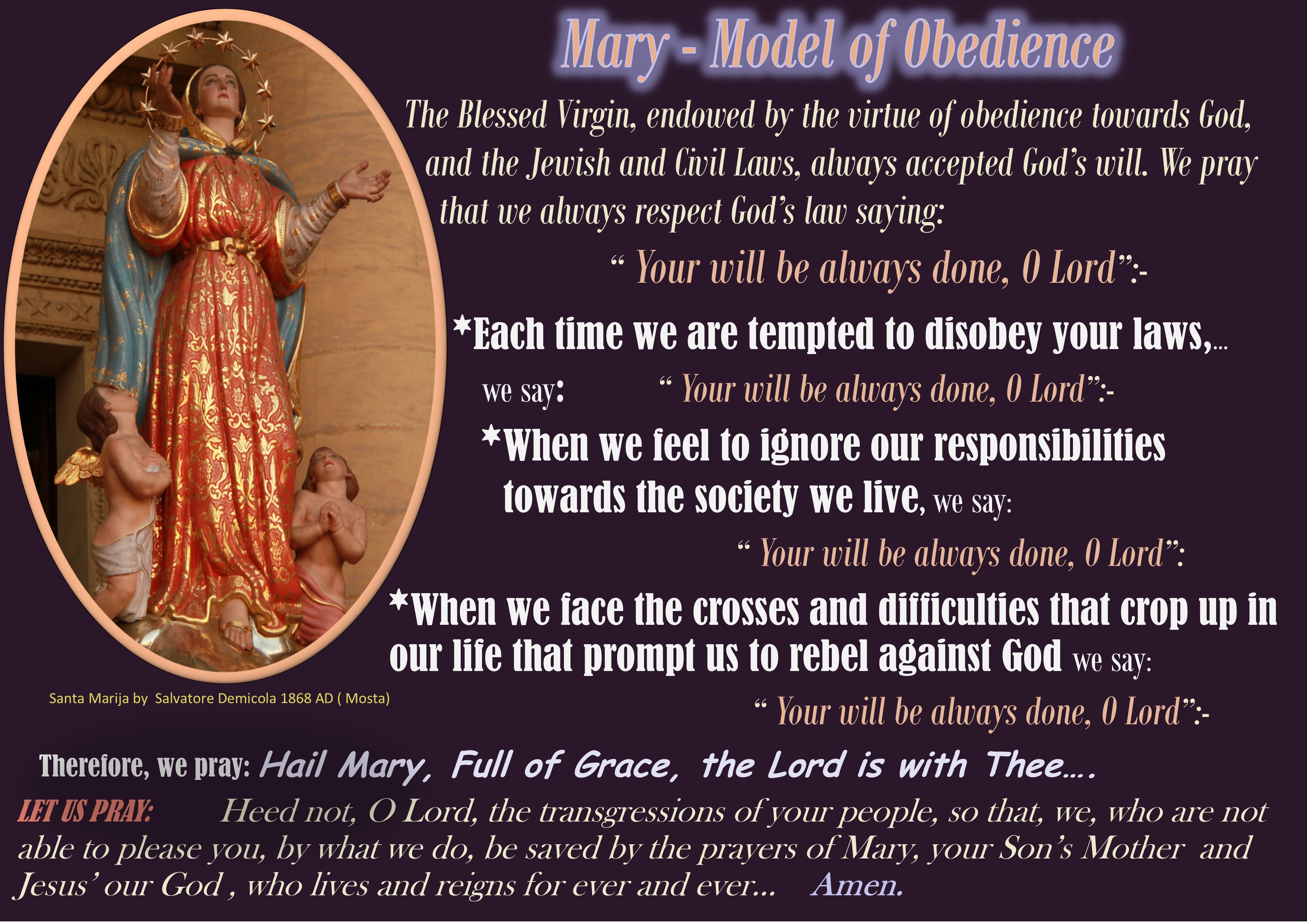 Mary at her Annunciation models faith for us. Mary trusted in God’s promises, was obedient to God’s word of invitation in her life, surrendered to the mystery before her, and committed herself to be part of God’s plan of salvation in Jesus.