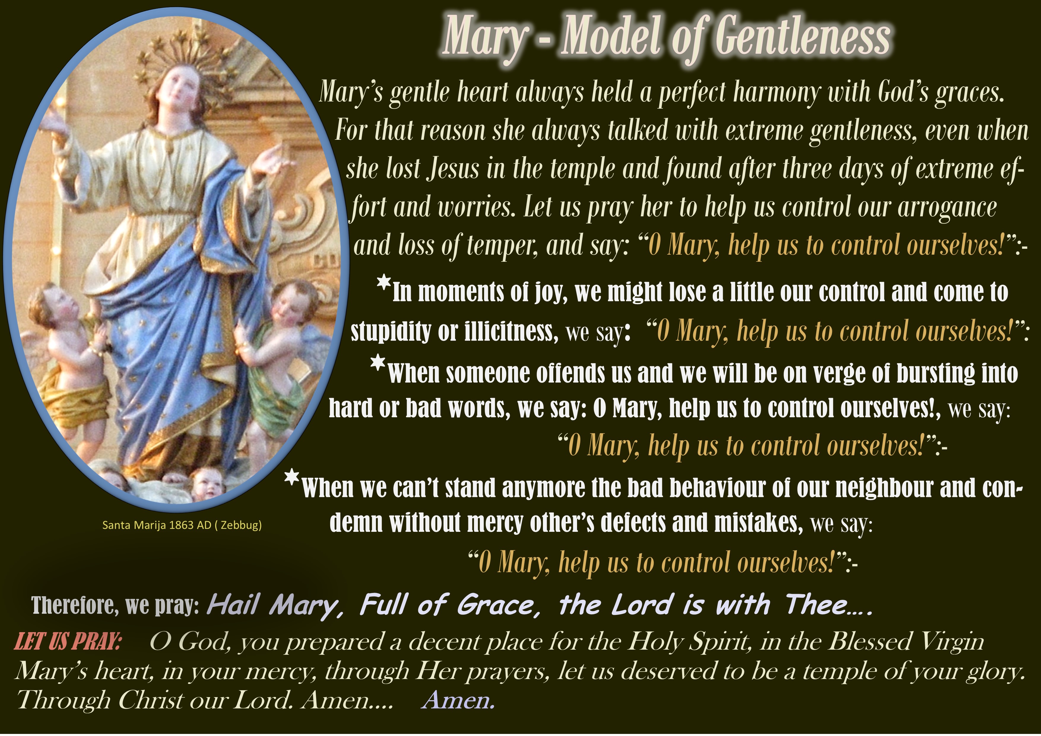 “Gentleness – Mary, our heavenly mother in our hearts exemplifies this fruit. The gentle person is not weak; has his/her power and strength under control and treats everyone they meet with kindness and understanding. The gentle person can forgive others and stop and think before acting. They are thoughtful and considerate.”
